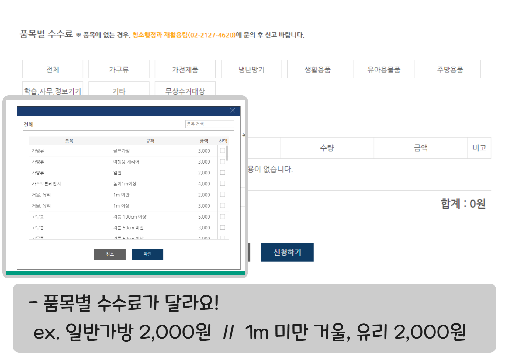 이렇게 자신이 배출해야 될 대형폐기물 접수를 하기 위해서는 금액별로 결제를 진행하시게 되는데요.
