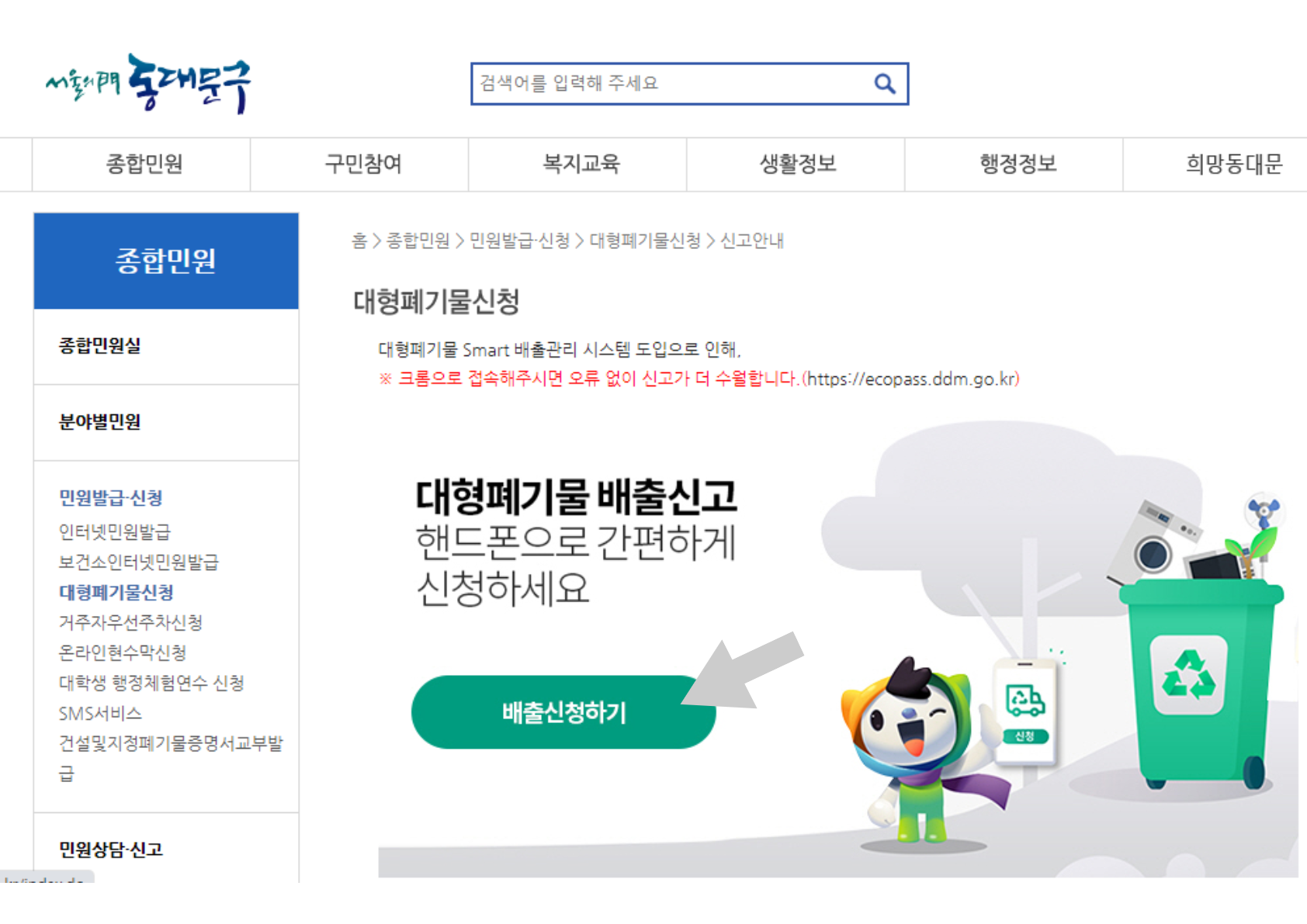 (대형폐기물 온라인 신청 예시를 들기 위해 동대문구청 홈페이지를 캡처해보았습니다.)
