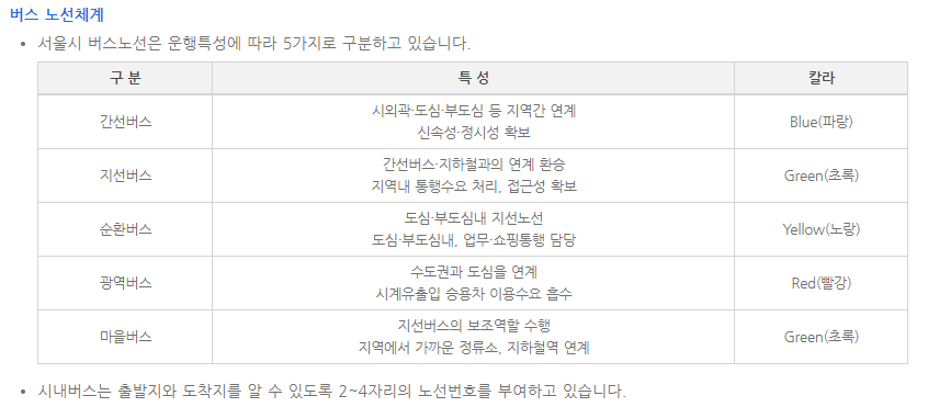 파란색의 간선버스 / 녹색의 지선버스 / 빨강색의 광역버스 / 노란색의 도심순환버스 순이죠.