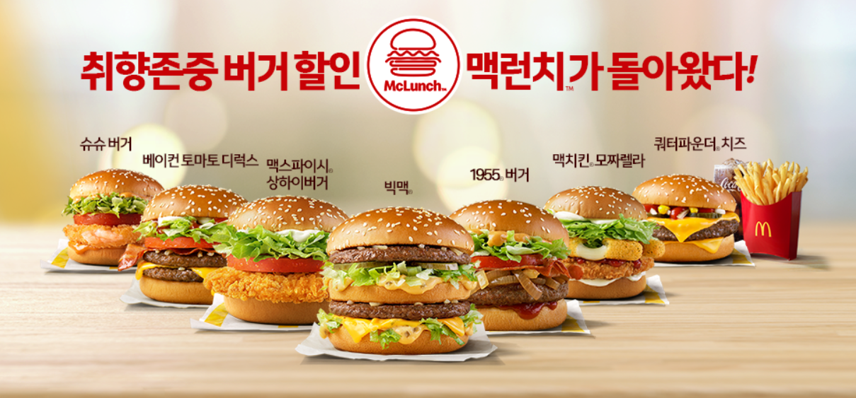 과거 맥도날드 맥런치가 사라지고 맥올데리아로 통합이 되었다, 최근 취향존중 버거할인 맥런치가 돌아왔다! 라는 타이틀로 맥런치 시간이 다시 생겼다고 하더라구요!